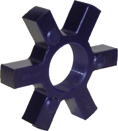 The most standard fundamental jaw coupling spider is a spider constructed of solid Nitrile Butadiene (Buna N) rubber (pictured at left). This flexible elastomer is oil resistant, resembles natural rubber in resilience and elasticity, and operates effectively in a temperature range of -40° to 212° F (-40° to 100° C). This rubber is well suited for cyclic loads (stop/start or reversing). Broadly speaking, this spider generally has a shore hardness of 80A, high dampening capacity, and good chemical resistance.